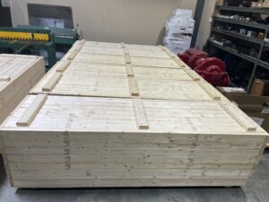 The Wood Equipment Fabrication and Repair Shop takes pride in their work, and it shows once again with their completion of another batch of Heavy-Duty Pump assemblies for an industrial customer. Each skid consists of a stainless steel Viking Internal Gear Pump coupled to a Nord Inline Gear Reducer, and Driven by a WEG Motor. All mounted on a painted steel base with TB Woods Sureflex coupling and machine guard. This customer also required that each assembly be custom-crated for shipment, so our shop team hand-built each crate from scratch according to the customer specifications.